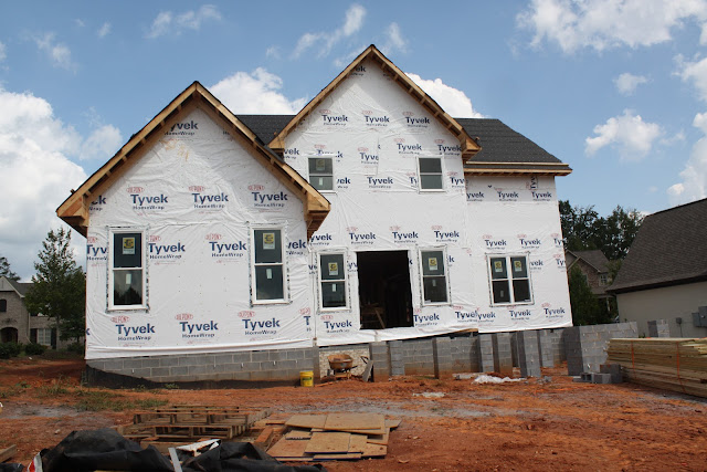 This week, the house got wrapped! The roof line of the main part of the house is completely finished including the tar paper that makes it really look like a roof. And most of the windows were installed. We stretched the budget a little bit and got Pella double hung windows. The double hung windows will allow us to clean the windows from inside the house. I don't know why that is important- we barely get the dishes and clothes clean on a weekly basis, but I guess if we or future residents of the house want clean windows, especially on the second floor, they will be able to be cleaned easily.